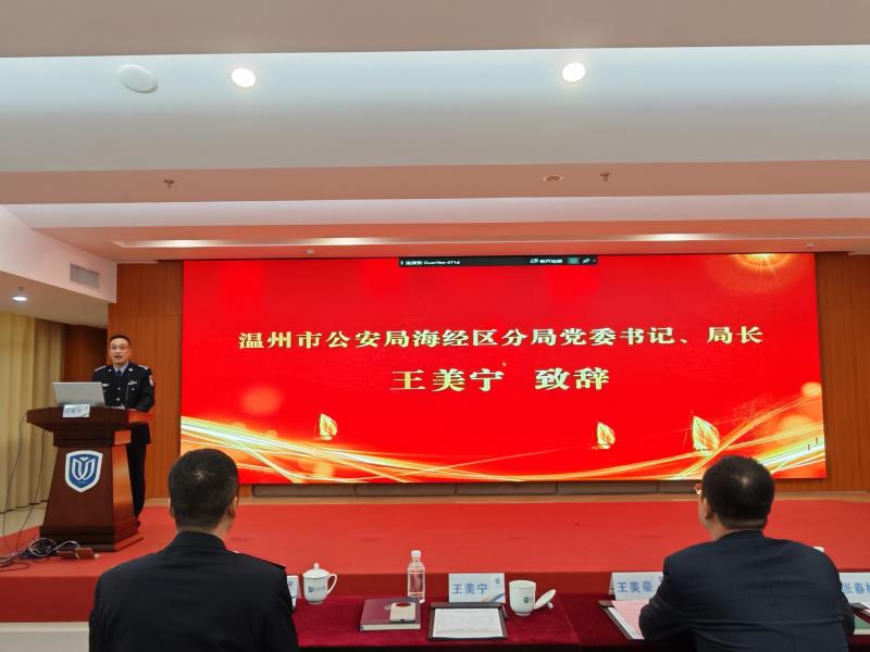 温州市公安局海经区分局党委书记、局长王美宁致辞。他表示,此次签约是一次“警察蓝”与“天使白”的双向奔赴,更是一场守护民生、共筑平安的庄严约定。他强调,将重点推动三项工作落地见效:一是构建快速响应机制,畅通警医联动流转渠道,明确对接流程、责任分工,确保突发事件发生后,公安警力、医疗救援力量第一时间抵达现场;二是打造专业协作体系,开展联合培训、实战演练,让民辅警掌握基本急救技能,让医护人员提升安全防范意识,形成“公安护平安、医疗保健康”的互补格局;三是拓展双向赋能场景,将围绕反诈宣传、禁毒科普、院区安防等重点,开展上门服务,帮助院方做好平安建设。