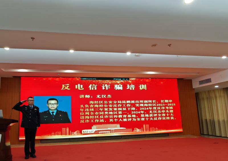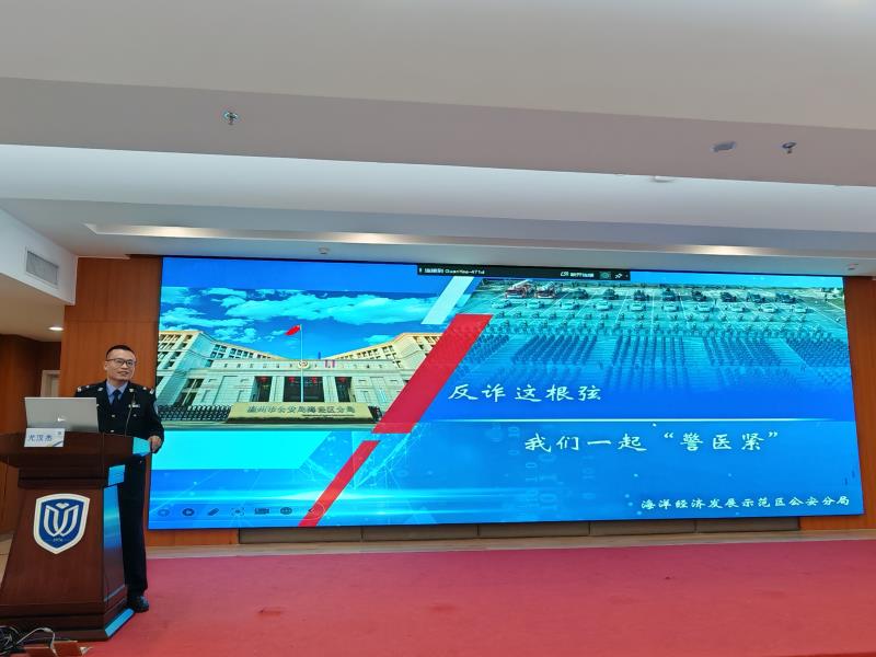 随后,海经区公安分局昆鹏派出所副所长尤汉杰展开题为“反诈这根弦 我们一起‘ 警医紧’”的反诈骗培训讲座。运用专业的反诈知识,配合生动鲜活的视频案例,深入浅出的讲解了如何辨识诈骗、如何防范诈骗,帮助医院职工掌握识别诈骗话术的技巧,切实增强医院职工反诈意识。