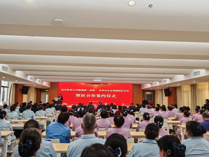 11月25日下午,温州医科大学附属第二医院(以下简称“我院”)与温州市公安局海经区分局警医合作签约仪式在医院瓯江口院区顺利举行。温州市公安局海经区分局党委书记、局长王美宁,党委副书记、政委姜益民,党委委员、副局长金邦考,副局长蔡耀慧,相关部门负责人及代表;我院党委副书记、院长王美豪,党委委员、副院长张春梅,党委委员、副院长吴爱悯,相关职能科室部门、临床科室主任及职工代表等出席签约仪式。双方主要领导及相关部门负责人共同出席,标志着警医双方在深化“平安医院”建设、优化医疗服务保障、促进培训交流等方面开启了“资源共享、优势互补、互利共赢、协同发展”的新篇章。