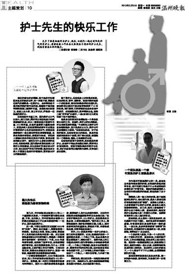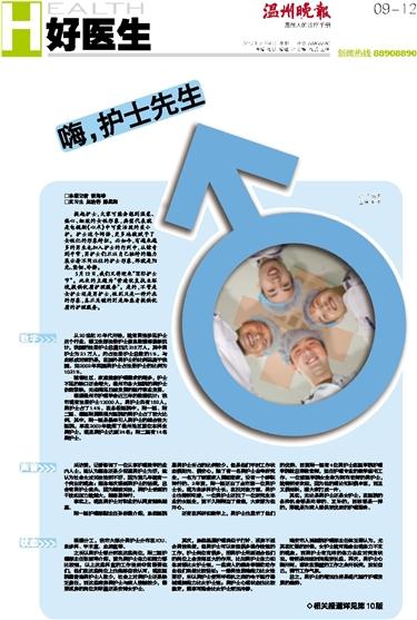 根据温州市护理学会近三年的数据统计:我市现有注册护士13000人,男护士共有182人,男护士占了1.4%。在各级医院中,附一医、附二医、温医附属眼视光医院的男护士占了较大比例。其中,附一医是最早引入男护士的综合性大医院,早在2003年就招了温州地区首位本科生男护士,现在男护士达到24名;附二医有14名男护士。