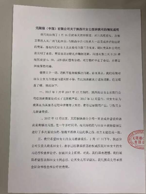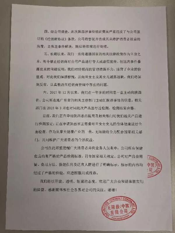 科技日报就此事联系涉事公司。1月18日晚,无限极给记者发来了“关于陕西田女士投诉我司的情况说明”,表示“健康高于一切,道歉不能彻底解决问题。必须承认,我们前期对田女士女儿的健康问题关怀不够,在此深表歉意并诚恳道歉。”