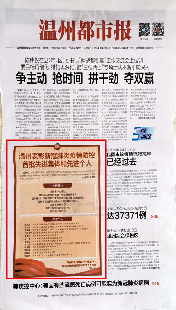 温州网讯 日前,温州市委、市人民政府发布通报,对新冠肺炎疫情防控一线工作中表现突出先进集体和先进个人(第一批)进行表彰,包括温州市中心医院等7个集体获得先进集体称号,陈身贤等12人获得先进个人称号。
