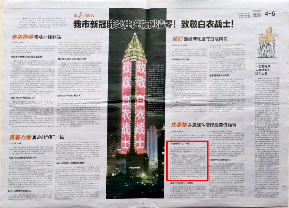 “从大年初一到现在,我们一家四口就没聚过一次。”孙维健告诉记者,大年初一妻子前往武汉前,他们便把13岁的儿子送往瓯海奶奶家,年仅3岁的女儿送往台州由外婆家照料。夫妻俩笑称,“一家四口在四个地方,共同为疫情作贡献。”援鄂的胡丹红则表示,忙的时候根本没时间去想孩子。“这个时候病人最需要我们,让他们出院是我最大的心愿。”
