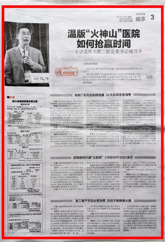 温医大附二院第一时间投身抗疫,短短7天时间完成改建温版“火神山”医院,34天时间实现患者清零。在这场成功的战“疫”背后,温医大附二院付出了多少的努力?日前,温医大附二院党委书记褚茂平向记者讲述战“疫”背后的故事。