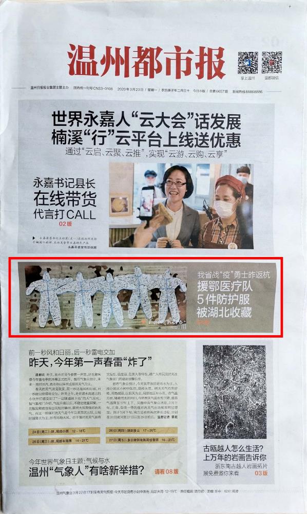 据了解,浙江援鄂医疗队的5件防护服将被湖北博物馆永久收藏。