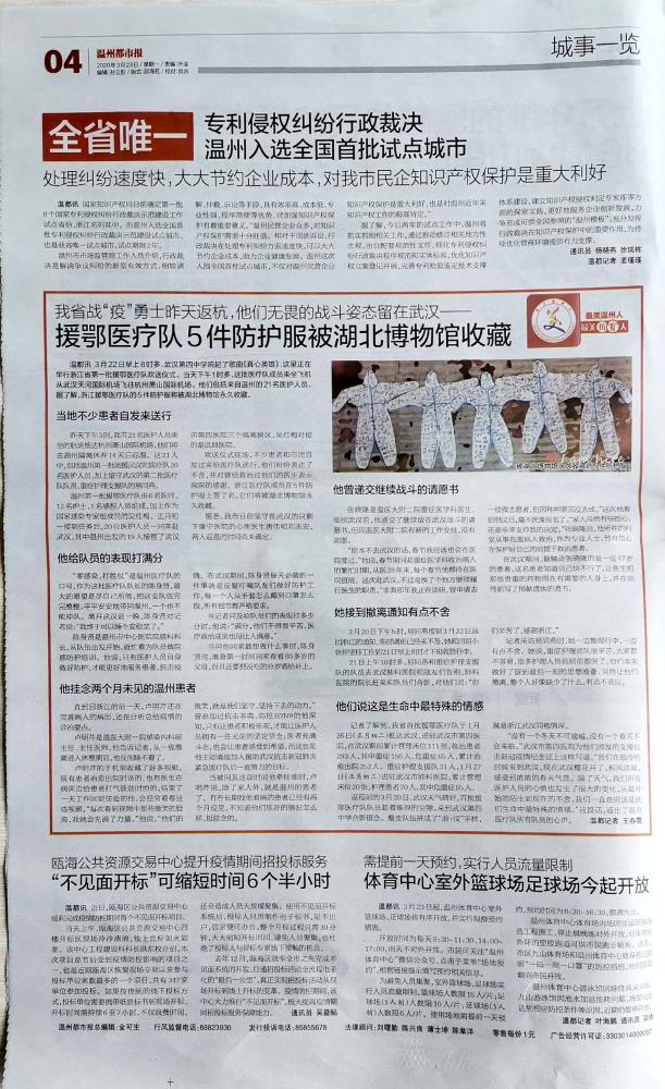 温州网讯 3月22日早上8时多,武汉第四中学响起了歌曲《真心英雄》,这里正在举行浙江省第一批援鄂医疗队欢送仪式。当天下午1时多,这批医疗队成员乘坐飞机从武汉天河国际机场飞往杭州萧山国际机场。他们包括来自温州的21名医护人员。据了解,浙江援鄂医疗队的5件防护服将被湖北博物馆永久收藏。