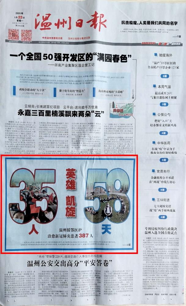 从农历正月初一启程赴武汉至今,58天的驰援与坚守,温州援鄂的白衣战士不负生命相托。他们与浙江医疗队的战友们携手共战,支援武汉市第四医院和武汉科技大学附属天佑医院,成功治愈新冠肺炎患者共计387人,把温州的大爱精神书写在荆楚大地上。