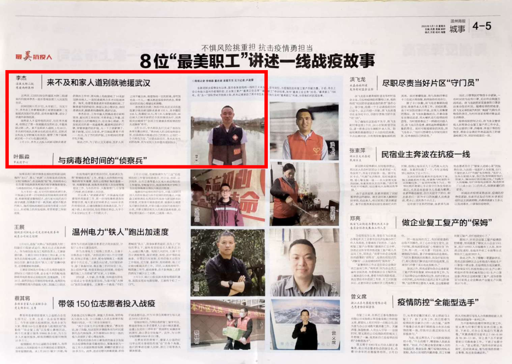 自新冠肺炎疫情发生以来,我市各条战线的一线职工义无反顾,坚守岗位,为疫情防控和复工复产贡献力量。日前,市总工会公布助力温州市疫情防控、企业复工复产“最美工会主席”“最美职工”寻访结果,其中“最美工会主席”30名,“最美职工”100名。在“五一”国际劳动节到来之际,昨天记者采访了其中8位来自不同行业的“最美职工”代表,分享他们的抗疫故事。