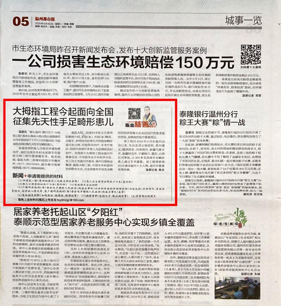 温州医科大学附属第二医院骨科学系主任高伟阳教授介绍,多指(趾)、并指(趾)畸形、分裂手、束带综合症等等先天性肢体畸形,是可治之病,早发现早治疗,手术疗效好。但由于先天畸形的矫正具有难度大、费用高、经常需多次手术等特点,许多贫困患儿无法得到及时治疗。大拇指工程设立专门帮助全国贫困患者免费实施手术,届时来自全国的手外科专家一起来温医大附二院做手术。