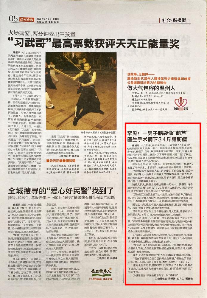 7月2日,记者从温州医科大学附属第二医院(以下简称“温医大附二院”)了解到,张先生原来是患了头颅骨旁脂肪瘤,于近日在该院做了切除手术。摘掉这个小“脑袋”后,最近一两天张先生便可出院。