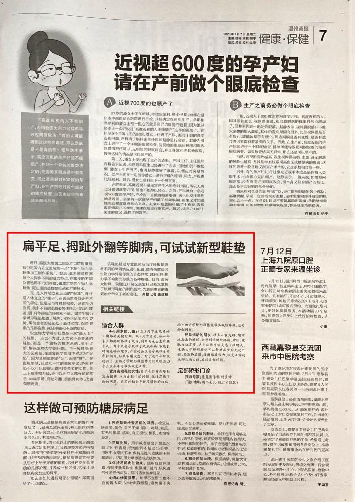 该鞋垫经过专业医师及治疗师根据患者不同的障碍情况进行配置,能有效解决因生物力学异常导致的步态异常,减轻因生物力学不均衡而导致的各种疼痛。目前,温医大附属二院瓯江口院区康复科已基本掌握了该矫形鞋垫的制作技术,为脚病患者的康复治疗带来了新的途径。