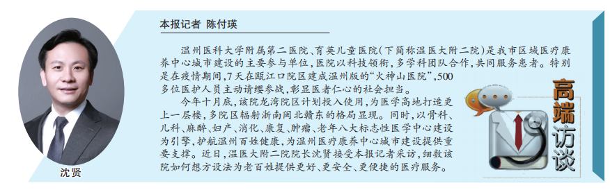 温州医科大学附属第二医院、育英儿童医院(下简称温医大附二院)是我市区域医疗康养中心城市建设的主要参与单位,医院以科技领衔,多学科团队合作,共同服务患者。特别是在疫情期间,7天在瓯江口院区建成温州版的“火神山医院”,500多位医护人员主动请缨参战,彰显医者仁心的社会担当。今年十月底,该院龙湾院区计划投入使用,为医学高地打造更上一层楼,多院区辐射浙南闽北赣东的格局显现。同时,以骨科、儿科、麻醉、妇产、消化、康复、肿瘤、老年八大标志性医学中心建设为引擎,护航温州百姓健康,为温州医疗康养中心城市建设提供重要支撑。近日,温医大附二院院长沈贤接受本报记者采访,细数该院如何想方设法为老百姓提供更好、更安全、更便捷的医疗服务。