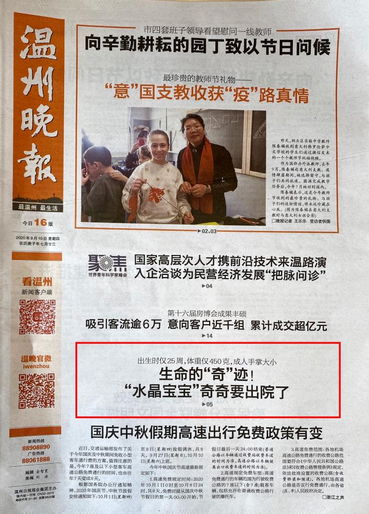 昨天,温州医科大学附属第二医院新生儿科病房内传来一个好消息,“水晶宝宝”奇奇——胎龄仅25周、出生时体重只有450克的早产儿今天终于可以出院回家了。