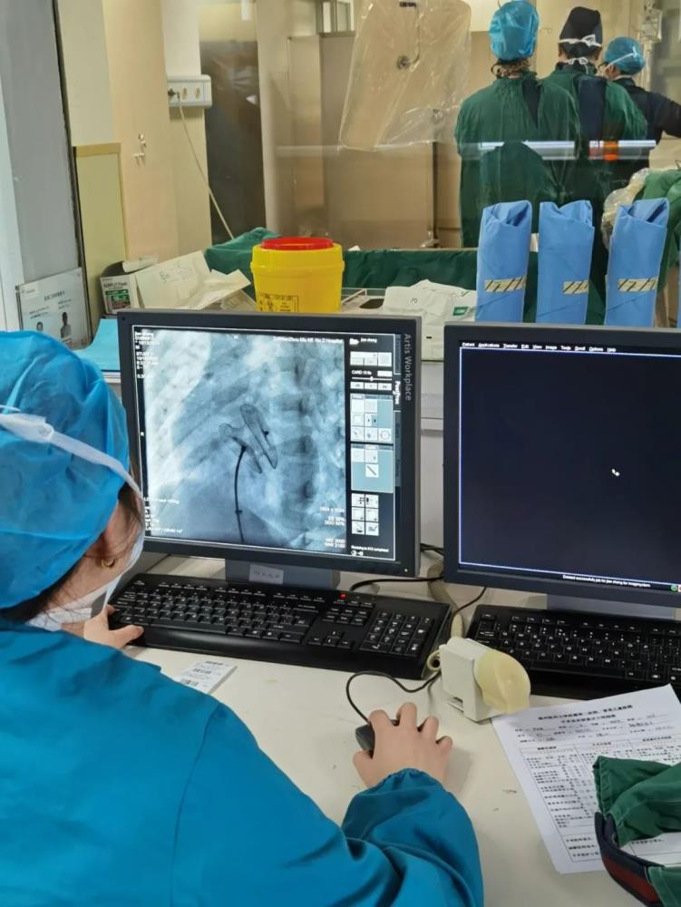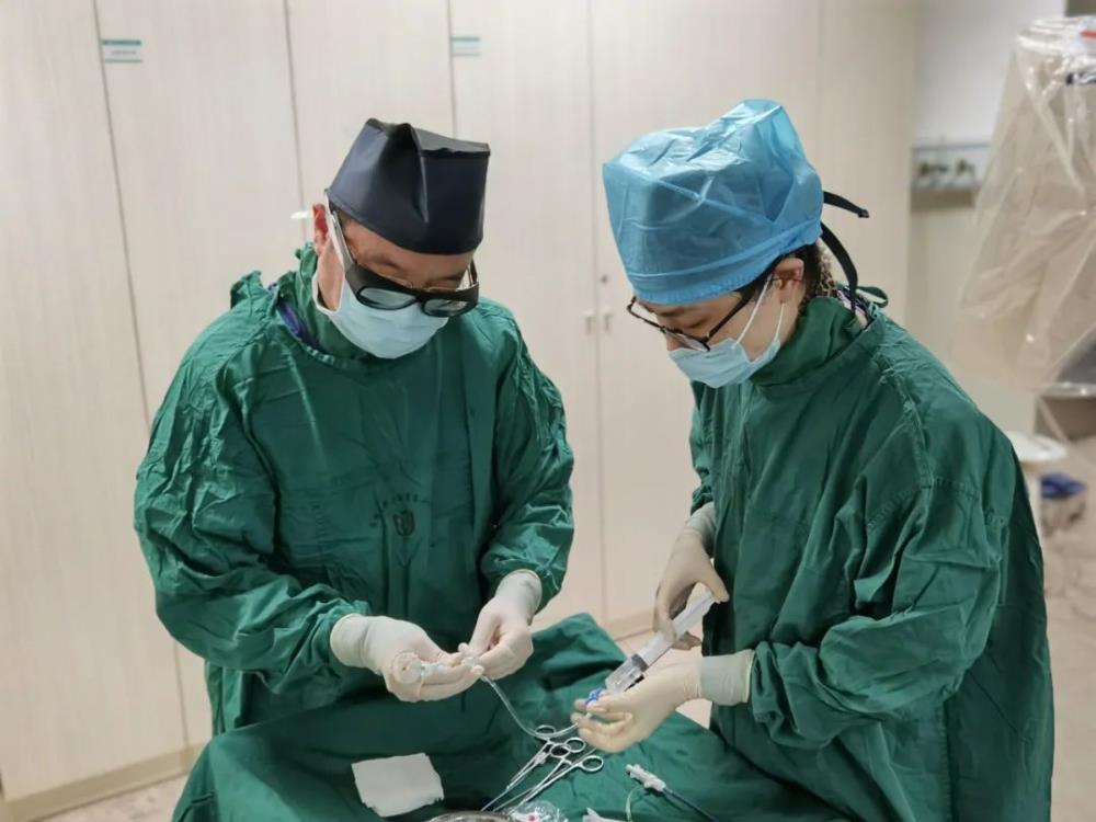 手术从上午9时开始,吴蓉洲、张松跃在坚参的右侧大腿根部,置入直径约3毫米的鞘管,再由腹股沟静脉插入一根直径1.67毫米的导管,完成右心房、右心室及肺动脉的压力与血氧等参数测定。吴蓉洲边检查边与外面的医生核对肺压力等数据。