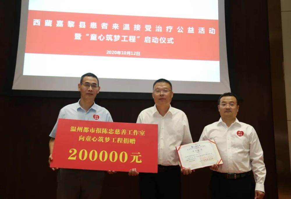 10月12日,童心筑梦工程在温启动,该工程由温医大附二院和本报联合主办,温州都市报陈忠慈善工作室向该工程捐赠20万元善款。