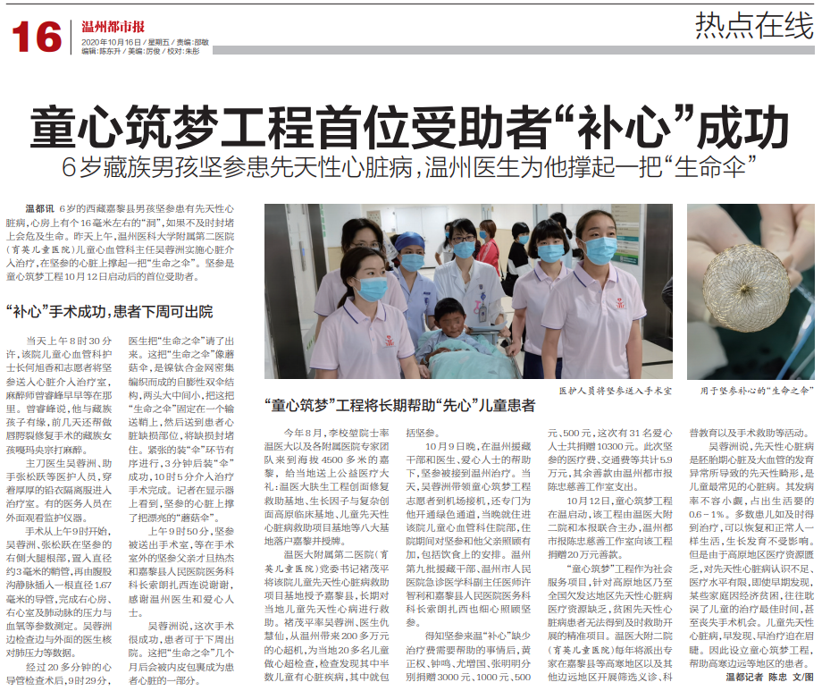 温都讯 6岁的西藏嘉黎县男孩坚参患有先天性心脏病,心房上有个16毫米左右的“洞”,已经出现右心室肥大和肺动脉高压,如果不及时封堵上会危及生命。昨天上午,温州医科大学附属第二医院(育英儿童医院)儿童心血管科主任吴蓉洲实施心脏介入治疗,在坚参的心脏上撑起一把“生命之伞”。坚参是童心筑梦工程10月12日启动后的首位受助者。