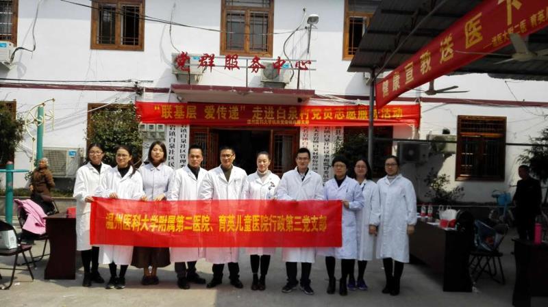 为深入开展“双下沉,两提升”下基层活动,搭建党员群众供需对接平台,改善提高农村基层医疗、健康养生服务水平,我院党委组织以行政第三支部为主联合妇产科第二党支部、超声影像科党支部、门诊系统党支部及病理输血科党支部等多个支部与温医大校统战部支部,以“三八”国际妇女节为契机,赴永嘉县大若岩镇白泉村开展健康服务到村头活动,为妇女们送上节日的关爱和问候。