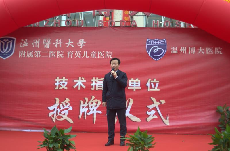 2018年12月12日上午,我院与温州博大医院技术指导单位授牌仪式在博大医院隆重举行。我院连庆泉院长以及分管业务副院长沈贤、医务处处长赵亚新和各科医学专家团队,温州博大医院缪维笋院长出席本次授牌仪式。此次参加授牌仪式的领导有瓯海区卫生和计划生育局张益品局长、潘进雷瓯海卫生监督所所长,黄新森医政医管科科长以及瓯海区妇幼保健计划生育服务中心黄素影副主任。到会的还有:瞿溪街道河头村老年大学代表;瞿溪街道、郭溪街道、泽雅镇等相关领导;浙江中立集团有限公司等企业代表。