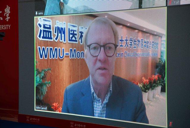 约翰·卡罗尔教授以远程连线的方式参加仪式并致辞。他特意将视频背景更换为上次来访温州时在联合研究院拍下的照片,并风趣地调侃,新冠疫情无法阻碍他与大家相聚。他表示,澳方高度重视与温州医科大学之间开展的合作,联合研究院的合作模式充分发挥了双方在临床资源、科研力量上的优势,是国际科技合作的良好范本。下一步,中澳双方将在感染、肿瘤、生殖医学等方面开展广泛合作。