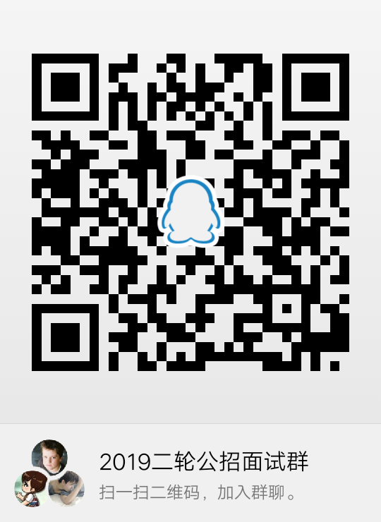 请入围面试的考生务必加入面试QQ群(19年二轮公招面试群)。必须实名认证才能加入,具体验证方式:准考证后三位+报考岗位+姓名。匿名人员将不能通过入群审核。考生可以通过QQ群及时了解面试工作最新动态。请入围面试的考生打开QQ,扫描群二维码加入