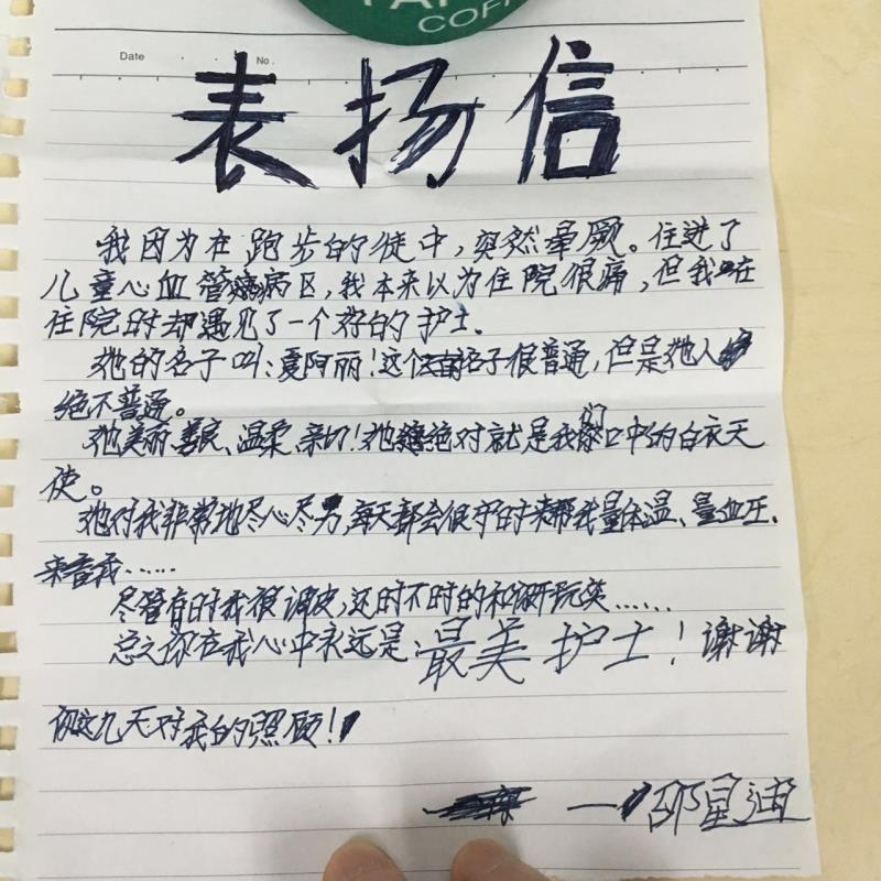 感谢A07儿童心血管病区夏阿丽护士