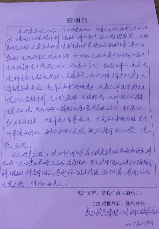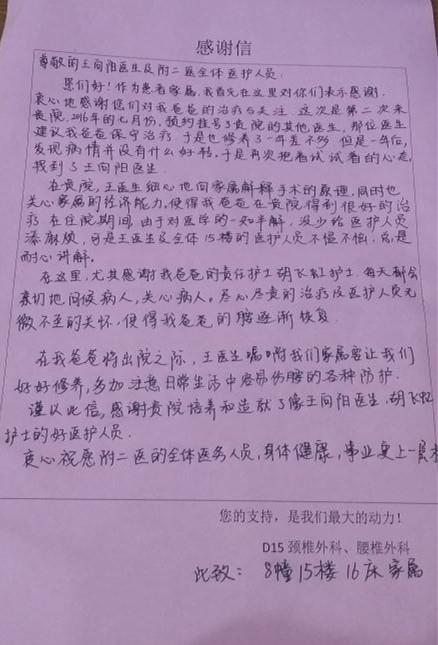 感谢D15颈椎外科、腰椎外科王向阳医师、胡飞虹护士及全体医护人员