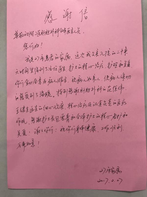 感谢H10肝胆外科范恒伟、王继生医师,包雪青护士长及全体护士