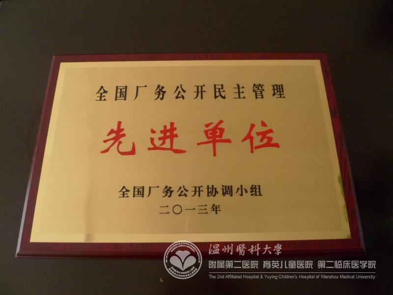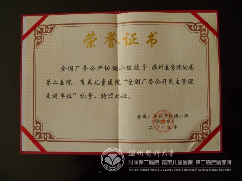 近日,我院被全国厂务公开协调小组授予“全国常务公开民主管理先进单位”称号,温州市文、卫、教、宣等系统单位仅我院获此殊荣。1月2日,温州市总工会李云中副主席、朱为帆部长亲临我院授牌并表示祝贺。