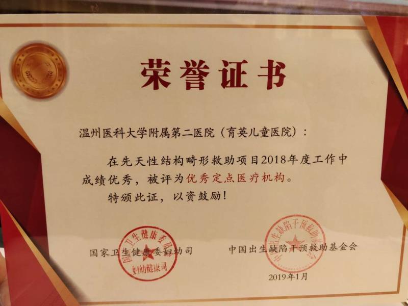 2019年1月9日,中国出生缺陷干预救助基金会、国家卫生健康委妇幼司在北京共同举办全国先天性结构畸形救助项目工作推进会及管理培训班。我院荣获全国先天性结构畸形救助项目优秀定点医疗机构。