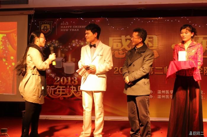 “龙腾丰稔岁,蛇舞吉庆年,爆竹欣祝福,银蛇喜迎春。” 2月25日晚,我院南浦院区19楼多功能厅里春意浓浓,欢乐满堂,到处洋溢着新春的喜人气息,“感恩·医路有你”—— 2013温州医学院第二附属医院、育英儿童医院师生联欢晚会正在这里隆重举行。温州医学院附属第二医院党委书记陈寿权、第二临床医学院执行院长李昌崇、党委副书记阮积晨以及各相关职能科室的负责人、各教研室主任、带教老师们与2013届全体实习生近500余人欢聚一堂,同贺新春。