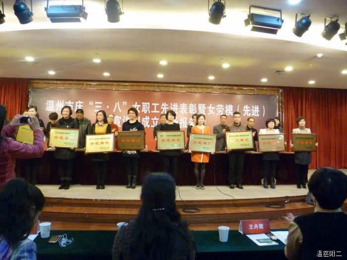 2013年3月7 日下午,温州市庆“三.八”女职工先进表彰会在市工人文化宫隆重举行,会上表彰了一批市先进女职工集体和个人,我院荣获“温州市工会女职工组织规范化建设示范单位”,并上台授奖。