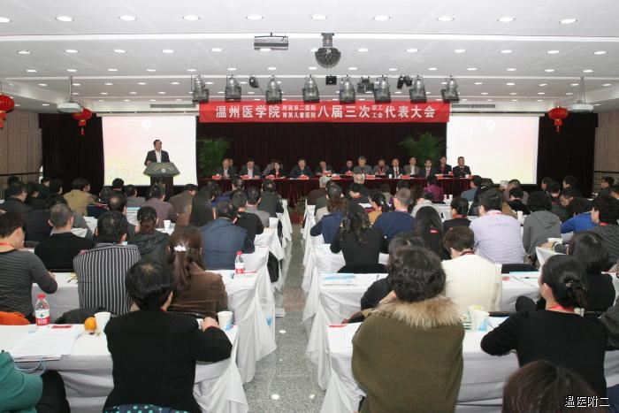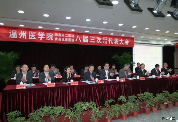 上午9时,第一次全体会议正式召开。医学院领导、我院领导班子成员及各代表团推选的团长在主席团就座,全体代表们起立齐唱国歌。大会分别由党委书记陈寿权、党委副书记许慧清主持。温州医学院陈肖鸣书记出席大会并致辞。