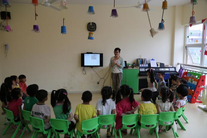 我们驱车来到幼儿园时,园长及老师们已等候门前。教室里小朋友们搬着他们的小凳子整整齐齐地坐成一排。四周五颜六色的墙壁、橱窗,别具特色的剪纸、贴画,还有太阳、月亮、气球等等形状的灯饰,处处洋溢着活泼可爱的欢乐,充满着无限蓬勃的生命活力。让人不禁想起记忆中的童年色彩。