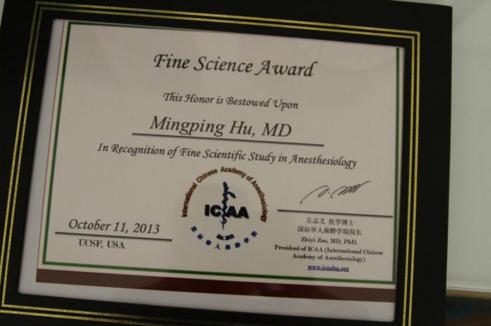 据了解,ICAA是为增加中外麻醉学者间的交流合作,为华人麻醉和围术期专业学者提供发表论文的国际平台成立的一个非营利性学术组织,总部设在美国宾夕法尼亚州的费城,在麻醉学界有较大的影响力。此次年会全球共有二十余篇麻醉论文进行了大会宣读交流,包括我院麻醉科的三篇论文。这也是我院麻醉医师在ICAA年会中初次进行论文交流并崭露头角。胡明品主任这次获奖,不仅是对他个人努力工作的肯定,也标志着我院产科麻醉团队临床研究和对外合作交流水平的提升,必将带动麻醉学科其他成员积极参加临床和基础研究,提高临床和教学质量,为麻醉学科和医院的发展添砖加瓦。