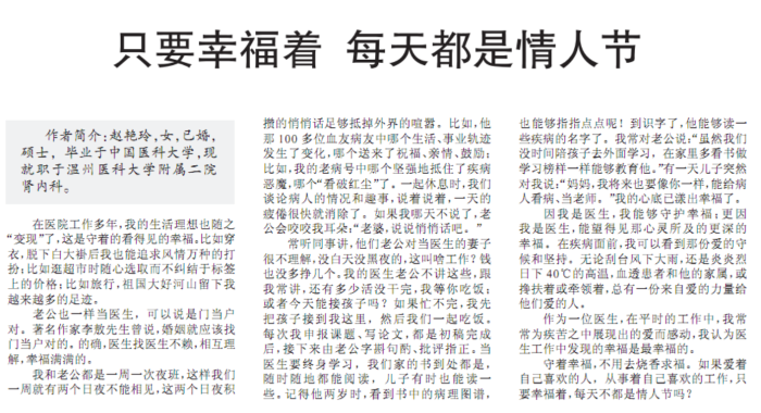今天,健康报刊登了我院肾内科赵艳玲医师一篇美文《只要幸福着 每天都是情人节》,她用自己细腻的笔触为我们描绘了一段医生家庭互敬互爱,相濡以沫的真挚情感,以及在救死扶伤的事业中寻找幸福的那份大爱。