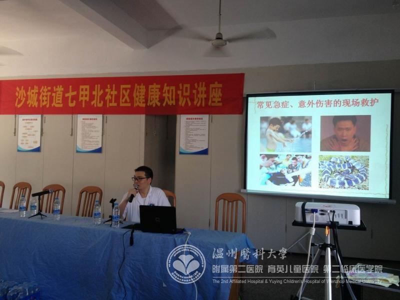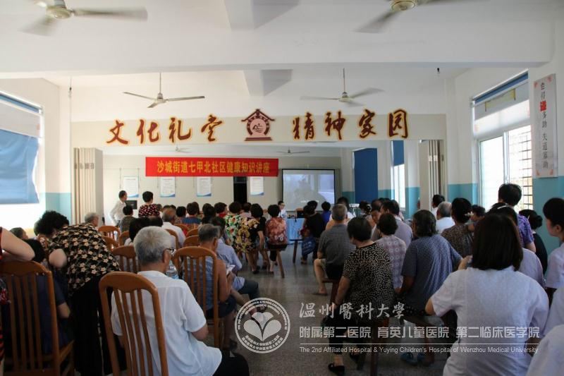 7月21日,顶着炎炎烈日,我院急救中心与脑外科10余位医护人员来到了龙湾区永强镇沙城街道七甲北社区开展健康知识讲座,美国Dreyfus健康基金会的“解决问题、促进健康”(PSBH)项目中国项目官员蔡昕伶女士也参加了此次活动。村民们对参加健康知识讲座的热情十分高涨,整个老年活动中心的会议大厅座无虚席。