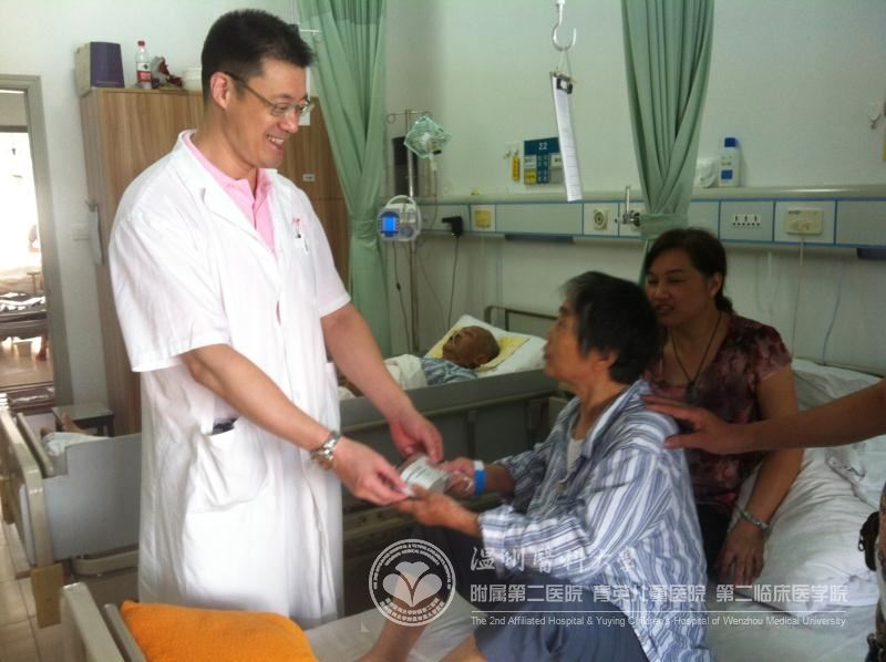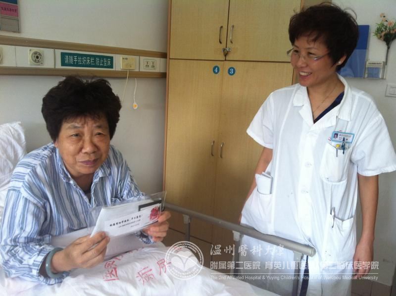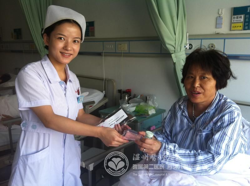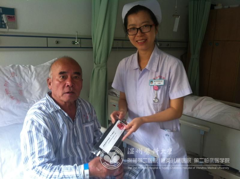 清晨的病房,大家像往常一样井然有序地忙碌着。医生们查房结束后,送温暖活动正式开始了。董其谦主任、林燕主任亲自把棉袜送到几位患者手中,并送上诚挚的祝福,责任护士们也纷纷加入送棉袜的行列。看着老人们脸上洋溢的笑容,满足感油然而生。虽然天气仍未转凉,但有个阿婆一拿到袜子就迫不及待地穿上,都说“老”小孩,其实老人有时就是年纪大了的孩子,一点小小的惊喜就很是满足。