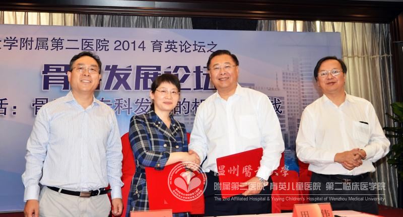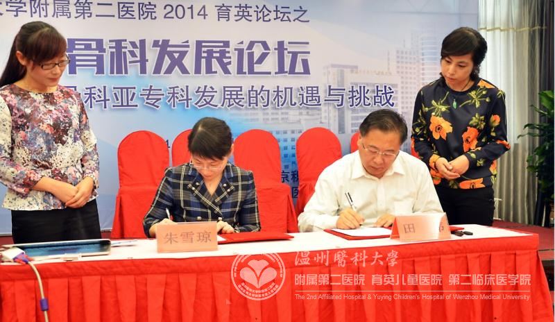 10月25日,中华医学会骨科分会主席、北京积水潭医院田伟院长率蒋协远副院长、创伤骨科主任王满宜教授、中华手外科学会前任主委田光磊教授等个七专科负责人共27人来我院访问交流。上午,积水潭医院一行参观了我院病房和骨科实验室,下午出席了我院于国贸大酒店举行的“2014育英论坛之骨科发展论坛”。双方就“骨科亚专科发展的机遇与挑战”进行了深入对话。会上,双方医院签署了合作协议,就人才培养、新技术和科研等方面进行广泛合作。温州医科大学瞿佳校长及我院朱雪琼副院长出席了论坛并致辞。