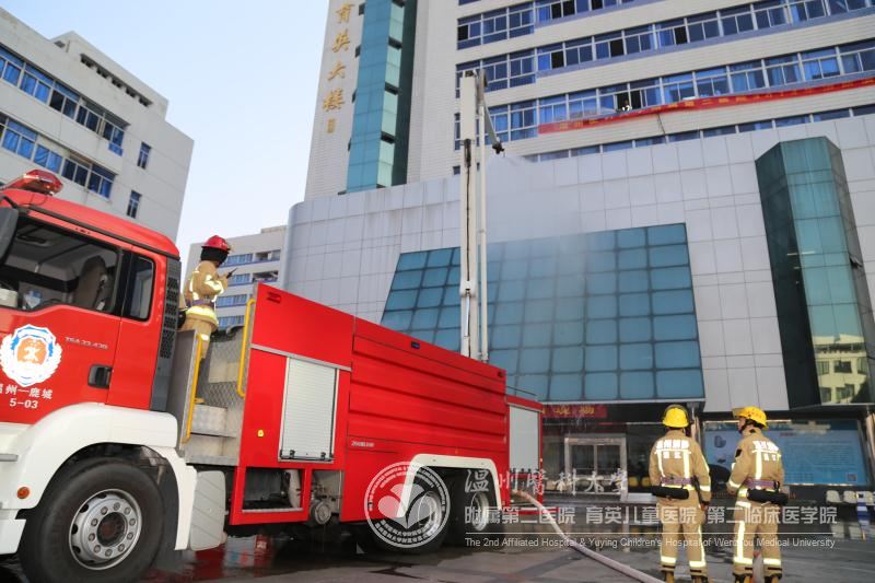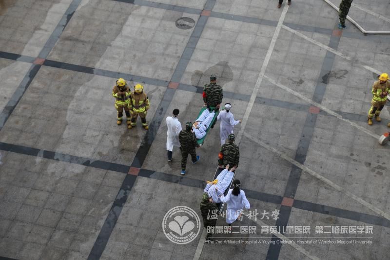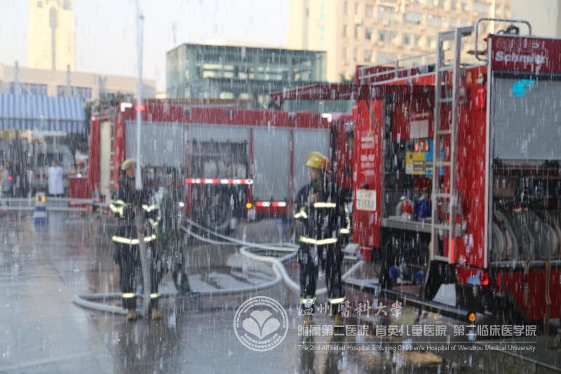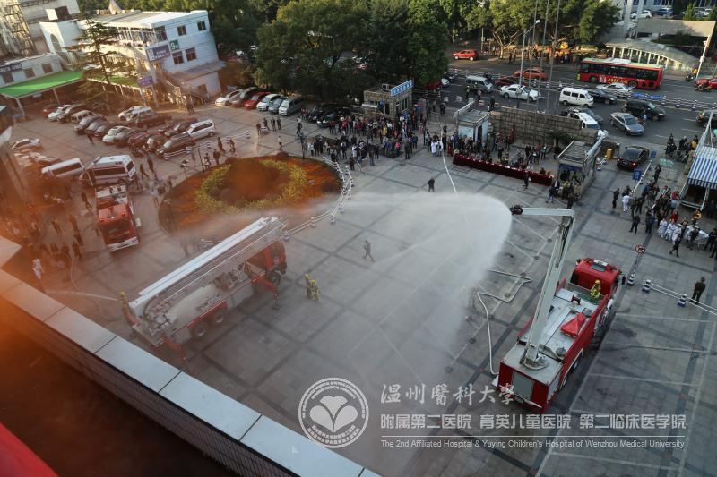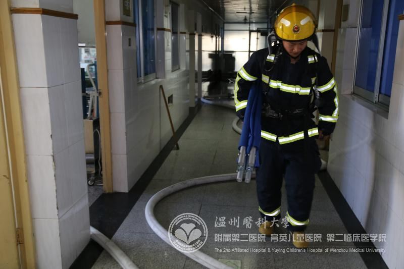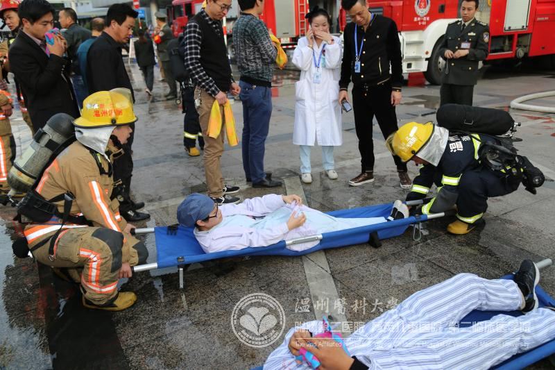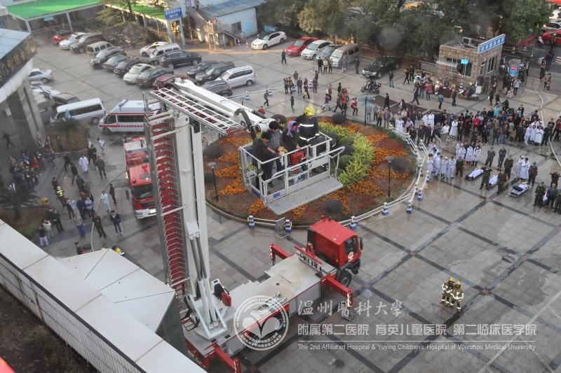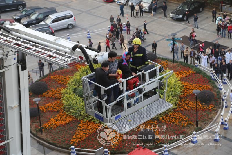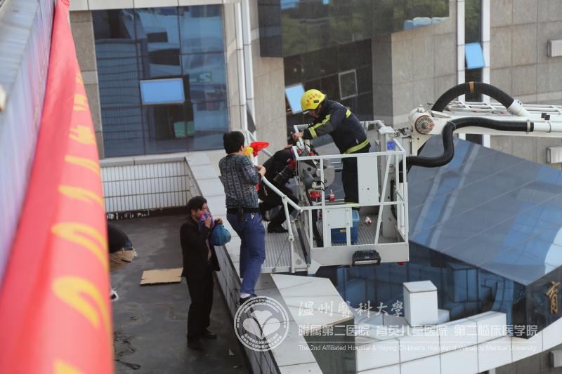“着火了,快救我们啊!”上周五下午,温医大附属第二医院学院路院区六号楼五楼平台的三个“病号”一边挥舞着手中的红色毛巾一边呼救。与此同时,六楼的几个窗口也冒出滚滚“浓烟”。别紧张!这并非医院真的发生了火灾,而是我院和温州市公安消防局鹿城分局黎明路中队、下吕浦中队、江滨路中队等联合举行的消防演习活动。