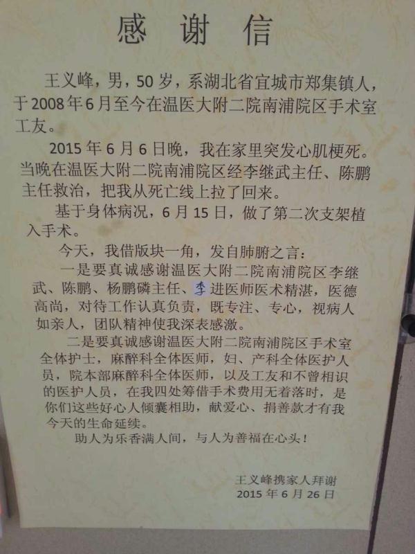 王义峰是湖北人,自2008年6月起在南浦院区手术室担任接送病人的工作,平时尽心尽责,与人和睦相处。得知王义峰不幸心肌梗死病发后,麻醉手术部的两位党员——手术室护士长吴洁、麻醉科副主任胡明品立即前去探望。在和心内科李继武主任医师、陈鹏主任医师了解病情时得知,王义峰还需要一次手术治疗,但是因为经济原因,他要放弃第二次手术治疗机会。