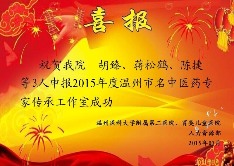 为培养高层次中医药临床实用人才,促进名中医药专家学术思想和临床经验的传承与发展,经个人、单位推荐和组织审核,我院胡臻、蒋松鹤、陈捷等3人申报温州市名中医药专家传承工作室获得成功。