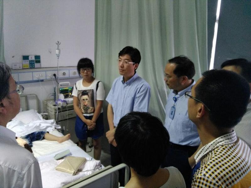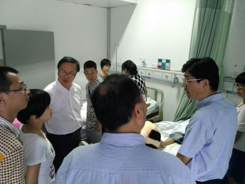 下午4时许,市政协余梅生主席一行、市委常委、市委组织部姚高员部长一行,先后在医科大瞿佳校长、我院连庆泉院长、褚茂平书记、唐疾飞副院长的陪同下,前往病房探望小君君。余伯伯亲切地安慰道:“孩子,这里有很多叔叔阿姨保护你,你一定要坚强!”