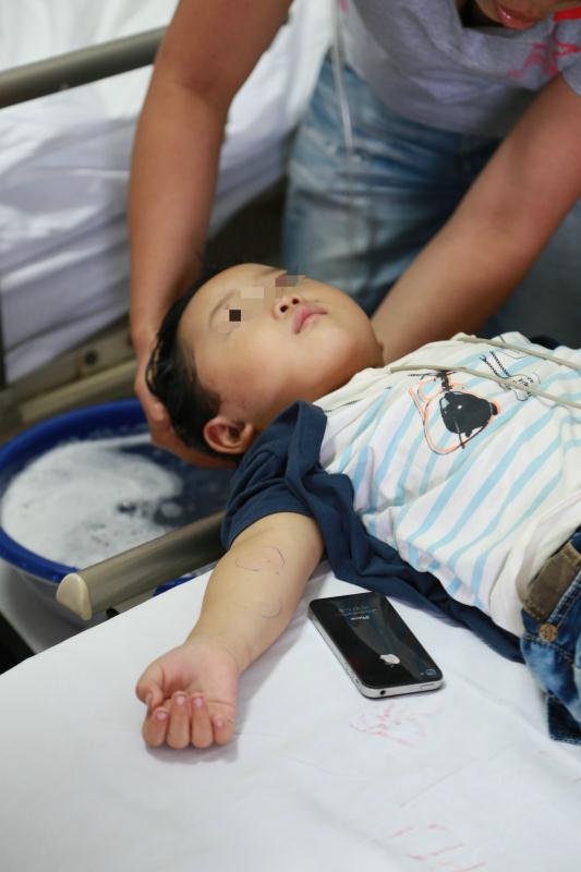 中午11时35分,小君君抵达我院,在急诊创伤外科病区接受治疗。接诊的吴伟军副主任医师发现:孩子左侧眼眶淤青,右耳流血已经3个小时,后脑左侧被石块撞击造成枕骨骨折、头皮血肿。11时38分,连庆泉院长第一时间指示:要集中医院最好的医疗资源和力量,除了要治愈孩子身上的伤,同时要及时给予心灵安慰,缓解孩子精神上的痛,确保孩子重新恢复身心健康。