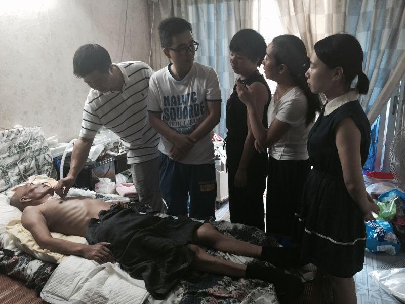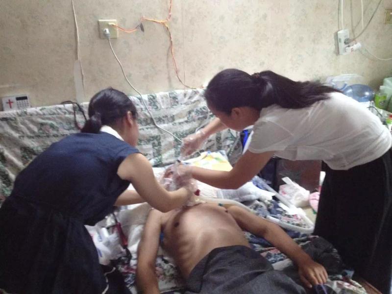 我们来到了患者狭小的卧房,只见他平躺在床上,胃管因有些脱出而不敢鼻饲,全身消瘦,双眼闭不上,右眼发红浑浊,气切处接简易呼吸机辅助通气,因忽略气垫床的使用及夜里规律的翻身,尾骶部已经出现压疮……见此情景,曾是他的主管医生张晓隆对其进行详细体检,为家属做病情说明和进一步的指导,护士闵小彦、蔡微微、黄玉如为其妥善固定胃管,及时鼻饲流质营养,教导注意事项;及时帮助眼睛初步清洁,并指导暴露性眼睛正确护理的方法;对于压疮的形成,也做了初步的指导和防护事项;患者在家不能坐起,我们协助指导家属尝试垫高靠垫,以利于身体功能的康复……