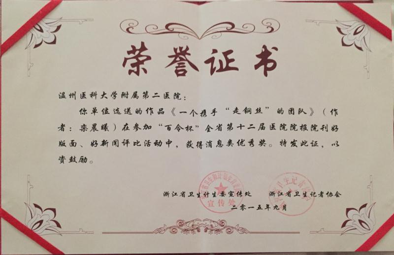 近日,“百令杯”全省第十二届医院院报好新闻评比交流暨通讯员新闻写作培训会在台州临海顺利举行。全省74家医院院报的299件作品参加本次评比。经过专家评审和集体评议,我院选送的《一个携手“走钢丝”的团队》获得消息类优秀奖。 荣誉的取得得益于我院长期以来注重探索医院文化内涵提升之路,通过多层次、全方位、广覆盖的多种宣传方式,着力加强医院宣传工作、努力打造职工素质提升新平台、积极培育优秀的医院文化,并取得了一定成效。我院院报作为医院文化建设的载体之一,在办报理念、版式、内容等方面也得到了不断改进与完善,在历年的全省医院院报好新闻评比活动中屡有斩获。