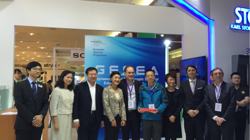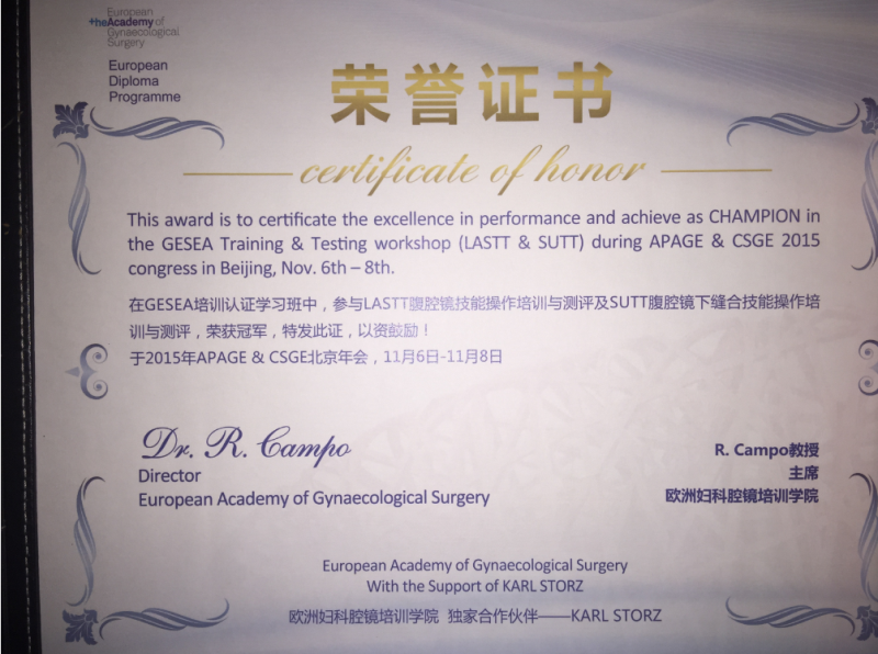 近日,我院妇科赵宇副主任医师应邀参加2015年度亚太妇科内镜学术会议及GESEA(Gynaecological Endoscopic surgical Education and Assessment)(欧洲妇科内镜技术教育和评定机构)在北京组织的培训及资格认定比赛。共有50名来自全国各个地区的医师参加了此次培训和比赛,选手们经过两天辛苦比拼,五轮激烈角逐,过五关斩六将,最终我院妇科赵宇副主任医师凭着缜密的心思、娴熟的技术、灵巧的双手打败了来自其他省份的50名选手获得了中国赛区第一名的好成绩,并以 8分30秒的成绩创造了该机构在其他国家培训及比赛时腹腔镜下缝合技术考核的最短时间记录,受到了欧洲内镜协会主席R.Campo教授的大力赞扬。由欧洲内镜协会主席R.Campo教授及卫生部妇科内镜培训主任段华教授亲自颁奖并宣布获得晋级参加明年欧洲内镜会议ESGE及比赛的中国代表资格。