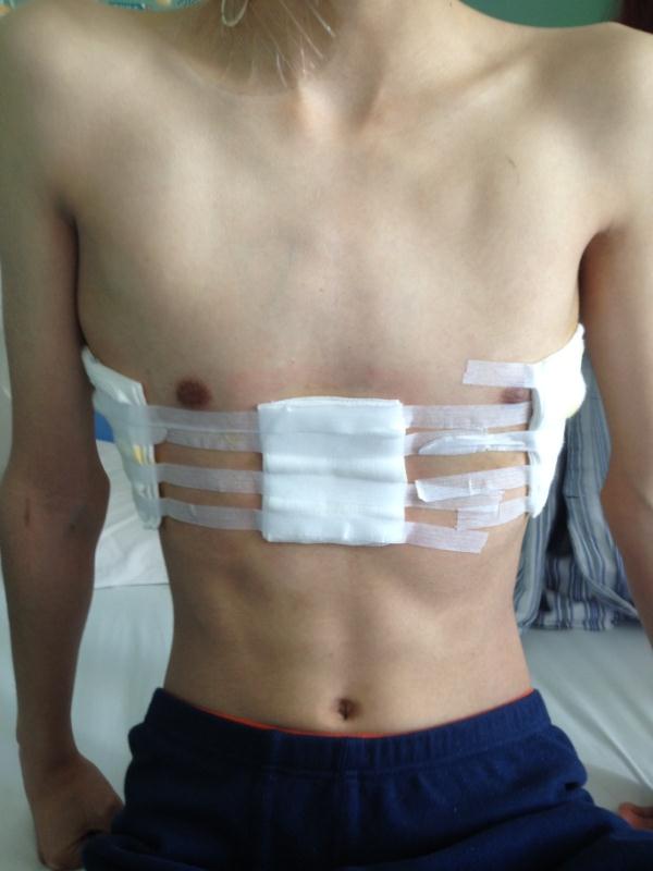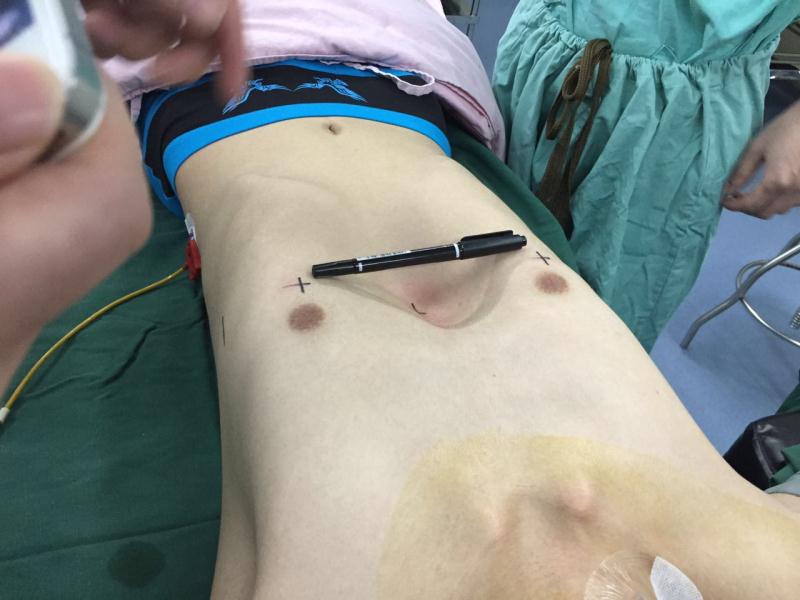 先天性漏斗胸患者目前的手术方法是需要在前后胸壁间植入钢板撑起胸骨,但由于小康的情况较为特殊,留给医生操作的空间十分有限,又加上心脏紧贴胸骨,手术操作时极易伤及心脏,这也成为摆在医生面前的一道难题。我院心胸外科胡型锑主任和赵琦峰主任对小康的病情进行了全面细致的评估和分析,在充分考虑手术难度及危险因素的基础上,决定在常规两侧胸开切口外,再在最凹陷处再增加一个切口,而这个切口是给术者用手牵拉胸板留出空隙,再用手慢慢引导钢板穿过空隙所用,这对术者的经验和手法的要求非常之高。手术由胡型锑主任主刀,平时只用30-40分钟完成的手术,这次大概用了近一个小时的时间完成。术后小康气促情况明显好转,再经过一段时间的修整,小康就可以和其他孩子一样,享受运动带来的乐趣了。