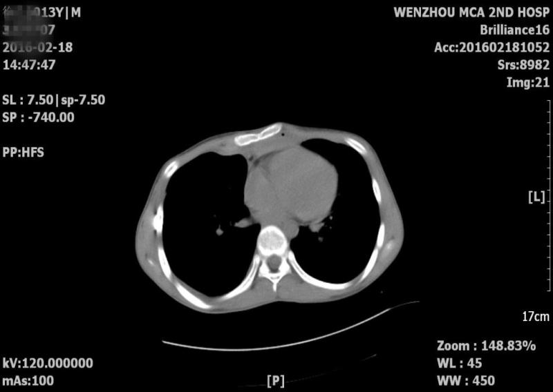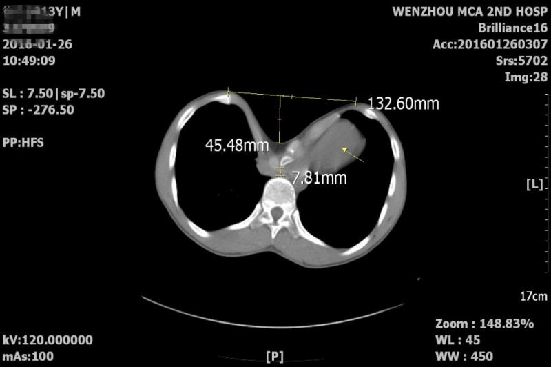 经医生检查,发现其胸骨中下部凹陷十分明显,形似漏斗。胸部CT提示前后胸壁间最短距离仅留下约一个小拇指厚度的空间,心脏完全被挤压至左侧胸腔,变形严重,也导致小康这半年来稍有剧烈活动,就透不过气或容易疲劳。这是典型的先天性漏斗胸,据了解,该病发病率约为0.1%,但是如此严重的患者在浙南地区、全省乃至全国都极为罕见。