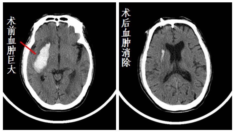 老章被推进了手术室,医生施以局部麻醉,在颅骨上开一个仅筷子粗的微小创口,利用导向仪,将一根带有刻度的硅胶引流软管从脑少血管区直接进入病灶,术中即可进行部分引流减压。手术过程不到30分钟。术后,老章被转入病房继续输注血肿溶解药物进行引流。次日,老章恢复清醒,对话无碍,手脚能动,已经能配合医护人员做术后的康复治疗。两天后,脑部的淤血被引流干净,一周后出院。经过一年半的复查,目前老章仅需按时吃降压药,就能维持很好的生活质量。
