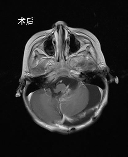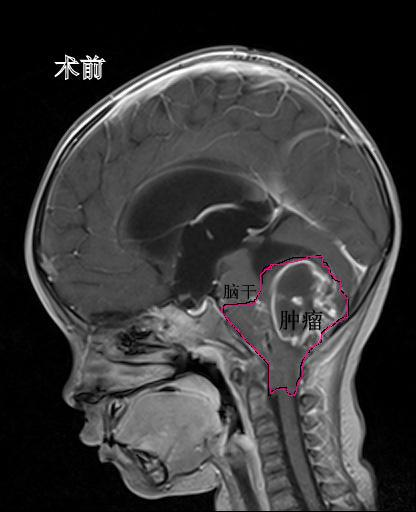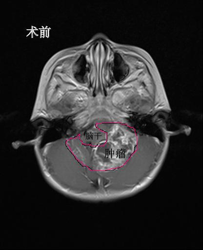 术前MR检查发现后颅窝巨大占位,脑干被肿瘤包绕
